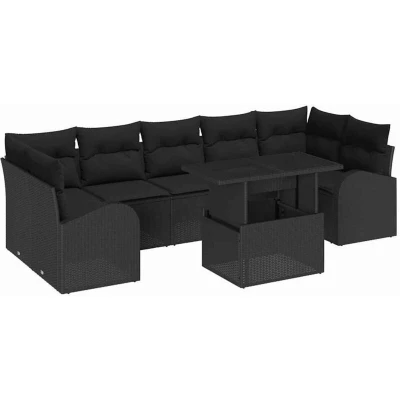 ManoManoGeneral description This Modern Rattan Outdoor Seating Set is a brilliant modular arrangement, perfect for any garden or terrace. It combines comfort and style, adding a contemporary feel to your outdoor spaces. The sleek lines and elegant vibe fit well with both modern and traditional gardens, making it an ideal choice for soaking up the sun with friends and family. Technical specifications Colour: Black Material: Poly rattan Overall dimensions: 100 x 55 x 73 cm (L x W x H) Weight: 68.4 kg Frame material: Poly rattan Filling material: Foam Indoor / outdoor: Outdoor only Number of items: 8 Assembly required: Yes Seat cushion removable: Zip fastening Compatibility and accessories Complete Set Components: 2 x Corner seat, 3 x Centre seat, 2 x Arm sofa, 1 x Table Installation Assembly required for setup. Usage Ideal for lounging outdoors. Modular design allows for rearrangement to suit your space and needs. Weather-resistant cushions provide comfort. Other information