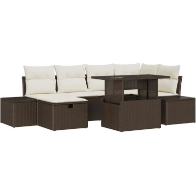 ManoManoGeneral description The Garden Sofa Set with Cushion is a stylish and practical addition to any outdoor space, including gardens, terraces, or balconies. It features a modern design with sleek lines and a textured finish that complements contemporary decor. This set provides a comfortable area for relaxation, complete with removable cushions and a tempered glass table. Technical specifications Colour: Brown Material: Poly rattan Finish: Textured Seat depth: 55 cm Assembly required: Yes EAN: 8721288400789 SKU: 3359875 Brand: vidaXL Compatibility and accessories Includes: 2 x Centre seats with storage function 1 x Corner seat with storage function 2 x Sofas with storage function 1 x Footstool with storage function 1 x Garden table Installation Assembly is required for the set. Usage Ideal for lounging outdoors. Removable cushions for easy cleaning and maintenance. Other information For maintenance, wipe down with a damp cloth. Use a waterproof cover when not in use to prolong the life
