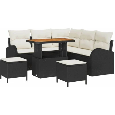 ManoManoGeneral description This garden sofa set is the perfect blend of modern style and flexibility, making it a brilliant addition to your outdoor living area. With sleek lines and a trendy vibe, it brightens up any garden or terrace. Built for comfort and practicality, it features cushy armrests and modular pieces that can be easily moved around to fit your space. Technical specifications Colour: Black and cream Material: Poly rattan, solid acacia wood, and powder-coated steel Overall dimensions: 90 x 55 x 71 cm (L x W x H) Weight: 49.4 kg Armrest height from seat: 55 cm Seating area: 55 x 55 cm (W x D) Filling material: Foam Indoor / outdoor: Outdoor only Number of items: 8 Assembly required: Yes EAN: 8721288444646 SKU: 3364345 Compatibility and accessories Includes: 2 x Arm sofas with storage function and water-resistant bags 1 x Corner seat with storage function and water-resistant bag 2 x Centre seats with storage function and water-resistant bags 2 x Square stools 1 x Table Usage