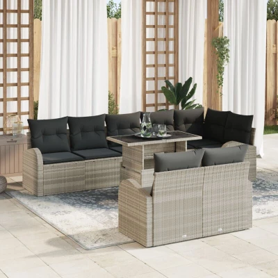 ManoManoGeneral description This outdoor garden sofa set perfectly combines modern style with functionality, creating an inviting outdoor living space that exudes simplicity and charm. Made for those who appreciate clean lines and minimal ornamentation, this sofa set transforms any garden or terrace into a relaxing retreat. The sectional design, coupled with versatile configurations, makes it suitable for both casual lounging and sophisticated gatherings, promising indulgence all spring through summer. Its lightweight, modular nature enhances portability and ease of rearranging to match any event or mood, making it a versatile addition to the outdoor decor. Technical specifications Colour: Light grey Material: Poly rattan, powder-coated steel, and glass Overall dimensions: 100 x 55 x 73 cm (L x W x H) Weight: 59.5 kg Seating area: 55 x 55 cm (W x D) Seating capacity: 9 Frame material: Powder-coated steel Indoor / outdoor: Outdoor only Assembly required: Yes EAN: 8721158987822 SKU: 3348668