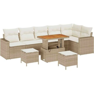 ManoManoGeneral description This Garden Sofa Set with Cushions in Beige and Cream is perfect for outdoor enthusiasts seeking comfort and modern aesthetics. Its sleek design and clean lines enhance any garden or terrace, making it an ideal choice for spring and summer gatherings. The woven poly rattan texture not only looks appealing but also integrates seamlessly with natural surroundings while providing sturdy seating. Technical specifications Colour: Beige and cream Material: Poly rattan and powder-coated steel Overall dimensions: 90 x 55 x 71 cm (L x W x H) Weight: 69.5 kg Seating area: 55 x 55 cm (W x D) Indoor / outdoor: Outdoor only Number of items: 9 Assembly required: Yes EAN: 8721288437051 SKU: 3363586 Compatibility and accessories Includes: 2 x Arm sofas with storage function and water-resistant bags 1 x Corner seat with storage function and water-resistant bag 3 x Centre seats with storage function and water-resistant bags 2 x Square stools 1 x Table Installation Assembly is
