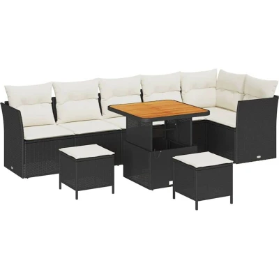 ManoManoGeneral description This stylish Garden Sofa Set mixes modern looks with practical design, creating a warm outdoor spot for chilling and socializing. Its simple, contemporary style, along with a soft woven texture, fits perfectly into any garden or terrace. It's great for making an impression, offering plenty of seating for hangouts or some alone time, so you’ve got both style and comfort for memorable spring and summer days. Technical specifications Colour: Black and cream Material: Poly rattan and powder-coated steel Overall dimensions: 80 x 80 x 71 cm (L x W x H) Weight: 67.3 kg Seating area: 55 x 55 cm (W x D) Frame material: Powder-coated steel Indoor / outdoor: Outdoor only Number of items: 9 Assembly required: Yes EAN: 8721288435699 SKU: 3363450 Included Components 3 x Corner seat including storage function with a water-resistant bag 3 x Centre seat including storage function with a water-resistant bag 2 x Square Stool 1 x Table Care & Maintenance Cover it with a waterproof