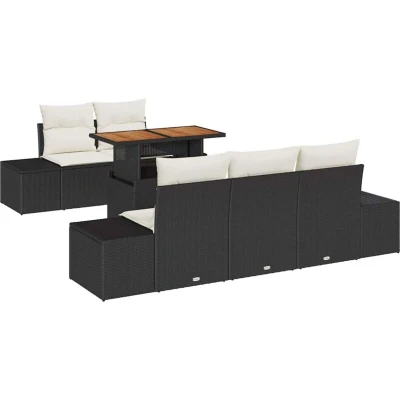 ManoManoGeneral description This rectangular garden sofa set features a trendy design, perfect for family meals or casual gatherings. It offers ample space for several people, making it ideal for hosting friends or enjoying meals with loved ones in comfort and style. Technical specifications Colour: Black Material: Poly rattan Seat width: 55 cm Seat depth: 55 cm Assembly required: Yes Delivery contains: 4 x Side sofas with storage function and water-resistant bags 1 x Centre seat with storage function and water-resistant bag 1 x Garden table EAN: 8721288388407 SKU: 3358637 Brand: vidaXL Other information