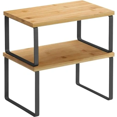 A set of 2 sturdy shelves with a stackable and expandable design, easy assembly, and a simple way to bring back your counter space as well as order and style. A messy counter top, cabinet, or pantry? Bring in these 2 shelves to extend your storage; spice bottles, canned goods—all of these chaos-makers can be tamed. When engineered wood meets sturdy metal, what’s gonna happen? A charming counter shelves set! You can show it off on the counter and make it a practical eye-catcher to spice up your kitchen. Supported by high-strength engineered wood and strong metal, the counter shelves can hold up to 15 kg each; feel free to put your coffee gear or panini press on them—they can take it. Do you want to stack them, nest them, separate them, or place them in an L shape to fit your space? Yes to all the above! Just find your way, customise your storage, and maximise your space.