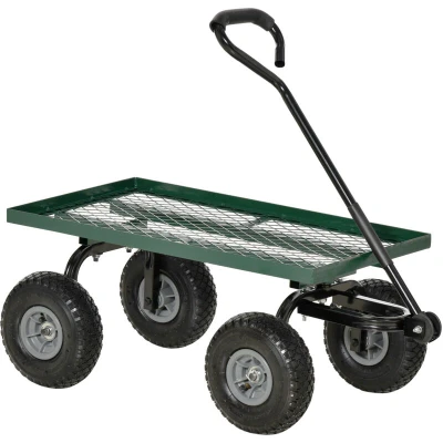 This highly functional garden cart wagon allows you to effortlessly transport heavy loads during gardening tasks. It features a padded handle that ensures a comfortable grip. The rubber wheels are engineered to simplify movement, providing smooth and stable transportation across various terrains, including gravel, grass and soil. This versatile transport cart model could be equally effective for relocating furniture or other items around your home or workplace. Specifications: ● Colour: Green, Black ● Material: Steel, Rubber ● Overall Dimensions: 94L x 48.5W x 100H cm ● Mesh Bed Size: 80.5L x 45W x 2.5H cm ● Mesh Bed Bottom to Floor: 35.5H cm ● Handle Size: 23W x 79H cm ● Wheel Size: Φ24 cm ● Weight Capacity: 150 Kg ● Item Label: B71-015V01YL Features: ● This garden trolly cart with wheels facilitates the transportation of heavy loads in your garden ● Stable steel frame structure that can support up to 150 Kg of load ● Handle equipped with a foam coating for added comfort during use ●