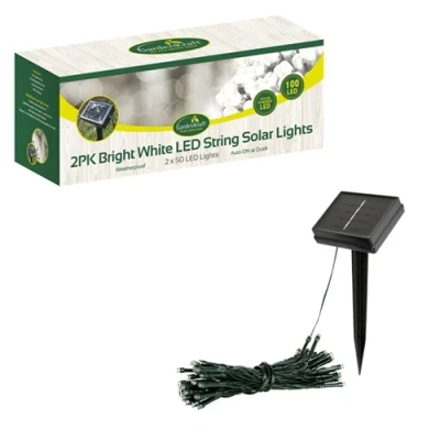 Electrical World5.9m Outdoor String Light2pk Bright White LED String Solar Lights2 x 50 LED LightsWeatherproofSolar Powered LEDAuto ON at Dusk OFF at DawnTechnical Specification:Light Colour: Bright White Number of Lights: 100