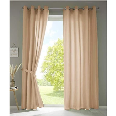Set of 2 opaque and translucent curtains made of micro satin with eyelets. The curtains come with a tie back. Micro Satin: This fabric combines the properties of microfibre and satin in an ideal way. Microfibre is very soft and keeps its shape, satin has a smooth top. This achieves a very elegant look. Attached with eyelets, silver-coloured, 4 cm diameter Our curtains are opaque, at the same time translucent and offer light sun protection. During the day, they conjure up beautiful light reflections in the rooms thanks to their light transmission. In the evening, they keep foreign eyes away, as only contours can be seen from the outside when the light is switched on. Box contents: 2 curtains with a tie back, colour: sand. Size: H x W 245 x 140 cm, the dimensions always refer to a curtain without ruffles. Material: 100% polyester, care: washable up to 40 degrees, easy-care, chlorine-free