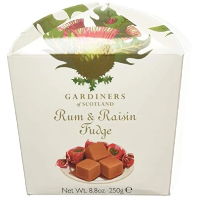 Gardiners of Scotland Rum & Raisin Fudge Beautiful Thistle Design Carton Luxurious Creamy Texture Traditional Family Recipe Perfect Idea for a Gift No Artificial Ingredients 250g