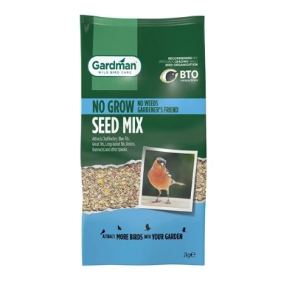 Gardman No Grow Seed Mix is a no mess and no waste mix. The gardener’s choice – a seed mix that contains no germinating seeds! A blend of sunflower hearts, peanut bites and suet treats. No grow: no weeds and no germinating seeds. Suitable for use in seed feeders, on bird tables and feeding.No grow, no weeds formulation.The gardener's choice.Includes oil rich sunflower hearts and peanut bites and suet treats.Attract more birds into your garden.How To Use:To use in bird feeders, simply pour the seed into a seed feeder. To feed on bird tables, scatter the seed across the table. Also suitable for feeding in tray and ground feeders.On Pack Accreditation: BTO - Recommended by Britain's leading Wild Bird OrganisationIngredients:Kibbled Wheat, Kibbled Maize, Pinhead Oatmeal, Flaked Naked Oats, Sunflower Hearts, Suet Pellets (Wheat Flour, Beef Tallow, Calcium Carbonate, Glycerine, Colourant), Kibbled PeanutsAdditive:Glycerine, ColourantGeneral Advice: Hygiene: Always ensure garden birds have plenty of fresh clean water for drinking and bathing. Clean feeding and drinking areas regularly with a mild disinfectant. Keep food fresh and dry, removing any wet food to prevent the spread of bacteria and diseases.Technical Specification:Product Group: Mixed SeedsProduct Type: Quad BagPack Size: 2KgSeason Suitable for: All year roundSpecies Suitable for: Chaffinches, Blue Tits, Great Tits, Long-tailed Tits, Robins, Dunnocks and other speciesUsage Suitable for: Seed feeders, bird tables and on the groundCountry of Origin: UKSafety Warning: Keep packaging away from children to avoid suffocation. Not Suitable for human consumption.Nut Allergy Warning: Contains nuts.Storage: Store in a cool, dry place. Best used within 3 months of opening.Recycle Status: Bag: Not currently recycled - Do not recycle.Dimensions: Length: 90mm x Height: 280mmWeight: 2Kg