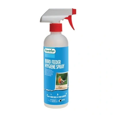 Ready to use cleaner kills bacteria, viruses and fungi to keep feeders clean. Contains 500ml. Use with a Gardman cleaning brush to keep feeders clean. Contains cationic and anionic surfactants.Ready to use cleaner that helps prevent bacteria, fungi and viruses.Use with a Gardman cleaning brush to keep feeders clean and safe for visiting birds.Ready to use easy spray bottle.Contains cationic and anionic surfactants.On Pack Accreditation (e.g. BTO): BTO - Recommended by Britain's leading Wild Bird OrganisationAdditive:NoneGeneral Advice: Hygiene: Always ensure garden birds have plenty of fresh clean water for drinking and bathing. Clean feeding and drinking areas regularly with a mild disinfectant. Keep food fresh and dry, removing any wet food to prevent the spread of bacteria and diseases.Technical Specification:Product Group: AccessoriesProduct Type: Cleaning AccessoryPack Size: SingleSeason Suitable for: All year roundUsage Suitable for: Feeders and accessories.Country of Origin: ChinaSafety Warning: Wear gloves and wash hand after using this product. Do not Mix with any other chemicals.Avoid contact with eye and skin. For external use only. In the unlikely event of irritation, seek medical advice.Storage: Store between 5 and 25 degrees Celsius. Store out of direct sunlight.Recycle Status: Plastic Bottle: Widely recycledDimensions: Length: 65mm x Height: 250mmWeight: 0.5Kg
