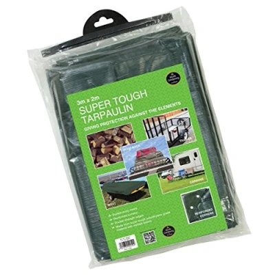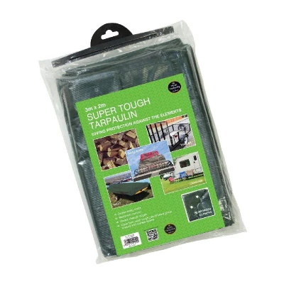 General description This super tough tarpaulin is made from cross laminated polyethylene grade material with welded seams, providing excellent protection against the elements. It is ideal for covering logs, trailers, roof racks, boats, and caravans. Technical specifications Material: Cross laminated polyethylene Size: 3m x 2m Reinforced corners Double strength edges Eyelets every metre Available sizes: 3 x 2m, 4 x 3m, and 5 x 4m