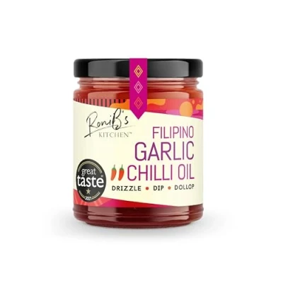 Searching for your favourite Filipino condiment and can’t find it anywhere? Looking for something new to try or gift to friends and family? Introducing our delicious Garlic Chilli Oil from RoniB’s Kitchen, a spicy condiment from Filipino cuisine that’s a nod to our Chinese heritage, perfect for bringing some heat to the kitchen A mouth-watering, award-winning chilli oil based on a family recipe from the Phillipines, this Garlic Chilli Oil is similar to chiu chow chilli oil, made using rapeseed oil, sesame oil, soy sauce, chilli and garlic granules to create a subtle kick in a jar that’s full of garlicky goodness A delicious addition to the food cupboard, this oil can be used for cooking, whether you’re making noodles, dim sum, soups, stews, or even pizza or pasta, added to a classic lemon butter sauce for an unexpected kick, or simply used as a salad dressing or for dipping bread Vegan and vegetarian friendly, this oil makes a great gift or gift hamper addition for birthdays, Christmas or just because. Each purchase comes in a 190ml recyclable glass jar and is made using minimal ingredients with no artificial colourings, flavourings or preservatives RoniB’s Kitchen opened in 2017 with the goal to take you on a culinary journey through the flavours of the Phillipines. All our products are lovingly created from family recipes and home memories alongside our award-winning manufacturer, using local and authentic Southeast Asian ingredients for the fullest flavours around