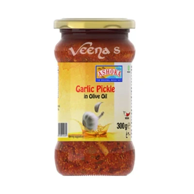 ASHOKA Garlic Pickle in Olive Oil 300g is a tangy, spicy Indian condiment featuring sun-ripened garlic, aromatic spices, and smooth olive oil for a bold, authentic flavor. Perfect with rice, bread, and snacks, it brings vibrant taste and fiery heat to every meal.