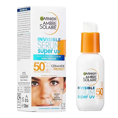 Garnier Ambre Solaire SPF 50+ Invisible Serum Moisturiser offers very high, broad-spectrum UV protection with a lightweight, invisible fluid texture suitable for daily use on sensitive skin. Enriched with Ceramide, it strengthens the skin barrier, is non-greasy, vegan, and cruelty-free—ideal as a makeup base.