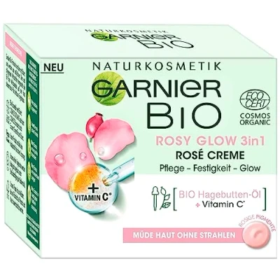 Garnier Face Cream, Bio Rosy Glow 3 in 1 rose for tired, dull skin, gives the skin a youthful glow, nourishes and firms with organic hip oil vitamin C, 50 ml