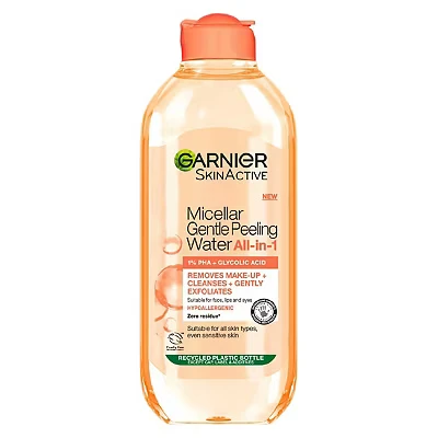 Garnier Micellar Gentle Peeling Water is a 1% PHA and Glycolic Acid-infused, all-in-one cleanser and exfoliant that removes makeup and impurities while brightening and smoothing skin. Suitable for all skin types, it requires no rinsing and can be used morning or night.