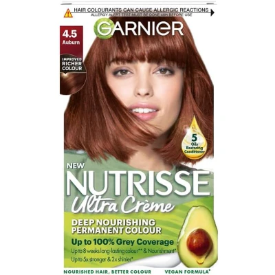 Garnier Nutrisse Ultra Crème vegan Hair Dye, 4.5 Auburn. Experience 100% grey coverage and a fiery, captivating 8 week colour. This no ammonia, formula gives rich vibrant auburn shade.