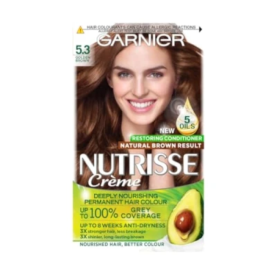 Garnier Nutrisse Ultra Crème vegan hair Dye, 5.3 golden Brown. For 100% grey coverage and warm, shimmering 8 week colour. This no ammonia, formula gives your a beautiful glow.