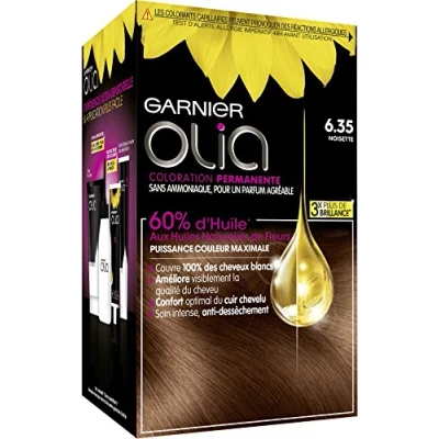 Permanent hair dye with natural flower oils for a pure, long-lasting chestnut-brown, visibly improved hair quality with optimal scalp comfort Results: Lighter hair that is nourished and protected against dryness, 100% grey hair coverage, a multitude of reflections, an intense and even colour Instructions: Perform an allergy test 48 hours before application. Read the instructions carefully before applying the product. Recommended quantity: 1 box (medium long hair), 2 boxes (long hair) Velvety, drip-free cream and formulated without ammonia for a light floral fragrance that is pleasant to use. The Oil Delivery System (O.D.S.) technology made up of 60% oil anchors the colour deep into the hair fibre Package contents: 1 x Garnier Olia permanent hair dye, Hazelnut (6.35). Includes: Gloves, applicator bottle, developer cream, colourant cream, conditioner and instructions for use