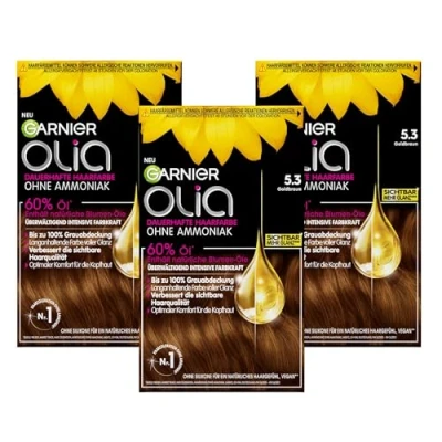 Garnier Olia Permanent Hair Colour without Ammonia, with Nourishing and Natural Oils, Full Grey Coverage, Colouration, No. 5.3 Golden Brown, 3 x 1 Piece