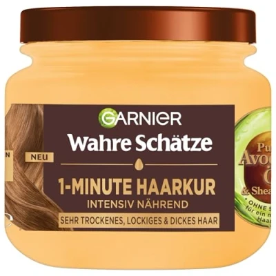 Very fast-acting hair mask for very dry, frizzy hair, 1-minute care with vegan and moisturising formula for intensive hair care Result: smooth and tamed hair from root to tip with up to 96 hours anti-frizz effect, for a natural hair feeling Directions for use: after washing the hair, work into the hair lengths and rinse again after 1 minute, then blow dry and style the hair as usual Rich and nourishing formula without silicone with natural care complex made from high-quality avocado oil and shea butter Box contents: 1 x true treasures 1-minute hair treatment with avocado oil and shea butter for dry and frizzy hair, 1 x 340 ml