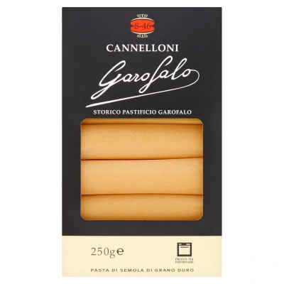 Garofalo Cannelloni 250g is authentic Italian pasta made from premium durum wheat semolina, perfect for oven-baked stuffed dishes with traditional texture and taste. Contains wheat; may contain soybeans and mustard. Store in a dry place at room temperature.