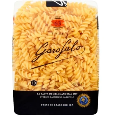 Premium Italian pasta maker Garofalo has been making high quality pasta since 1789 in Gragnano near Naples, the birth place of pasta in Italy. Pasta di Gragnano IGP status. A guaranteed seal that officially recognizes the quality of pasta made in Gragnano The spiral shaped design of fusilli makes them perfect for holding chunky sauces, from rich meaty sauces to the simplest of tomato sauce. The fusilli shape is very versatile and works well in a fresh pasta salad Suitable for both Vegan and Vegetarian diet. Kosher Made with 100% superior quality durum wheat semolina that is high in protein and results in an al dente cooked pasta texture Garofalo pasta has a rough porous surface due to the dough passing through a bronze die to form each shape, allowing the sauce to stick and absorb into the cooked pasta giving a delightful eating Experience! Fusilli originates in central south Italy with the word fusilli coming from the Italian fuso meaning spindle. They were originally created from the idea of rolling spaghetti around a knitting needle. Egg Free Dry Pasta