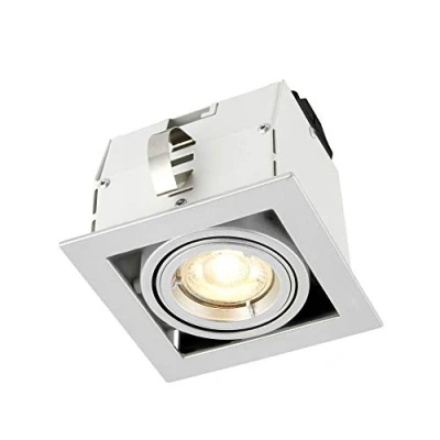 Modern designed boxed energy efficient recessed ceiling light. Adjustable 20 degree tilt spotlight allowing light concentration where it's needed Compatible with GU10 LED lamps for lower maintenance and running costs. Durable slim profile mains voltage downlight with simple clip in design for quick lamp replacement Robust die cast aluminium construction for use in commercial or domestic environments. Silver effect paint finish. 2 year guarantee for peace of mind Lamp Type: 7W 240V LED GU10 (Not Included) Dimensions: 103mm Projection x 110mm Square x 125mm Minimum Void (100 x 100mm Cut Out)