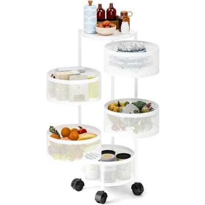GarveeLife Kitchen Storage Trolley with Wheels 5 Levels Rotating Fruit Basket Made of Carbon Steel Multilayer Vegetable for Office Bathroom White
