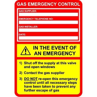 Gas emergency control gas suppliers, in the event of an emergency contact details label Self adhesive sticker 100mm x 70mm Stickers come on sheets of 9 for easy application