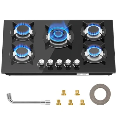 Gas Hob 5 burners, Built in Black Glass with Flame Out Protection,Gas Cast Iron Supports,NG/LPG Convertible