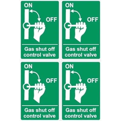 Gas shut off control valve sign 100x150mm pack of 4 stickers on A4 sheet Remove backing film and apply to dry, smooth, oil free surface. Comes on easy to peel sheets for handy application.