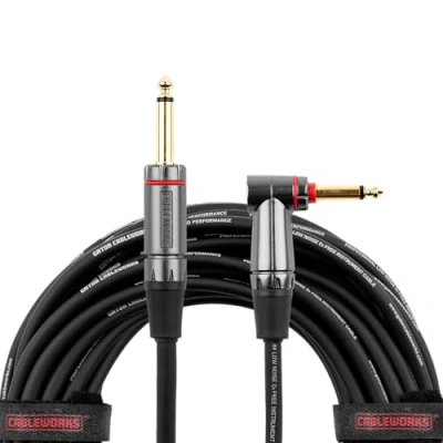 20-foot instrument cable with straight to right angle 1/4-inch ends for extended reach in stage, practice and studio setups Integrated quiet switch on one connector to reduce noise when plugging and unplugging the cable Fine stranded 99.99% oxygen-free copper conductor with braided shielding for low capacitance signal transmission Thick 7.0 mm soft PVC jacket with gold-plated brass connectors and strain relief for durability Includes TORIColor ID rings for easy identification of cables and a storage bag for organization