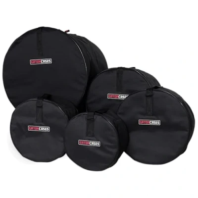 Durable 600D Nylon Construction 10mm Padded and Lined Interior Comfortable Carrying Strap Collapsible Compact Design Includes a 22" x 18" Bass Drum Bag, 10"x8" and 12" x 9" Tom Bags, a 16" x 16" Floor Tom Bag, and a 14"x6.5" Snare Drum Bag
