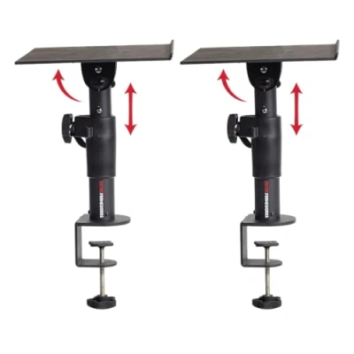 Pair of (2) desktop studio monitor clamp-on stands 12"/305mm x 9"/229mm speaker platform with soft, EVA-lined surface Clamps to desktop surfaces 2. 25"/57mm in thickness. Fits most small-sized studio monitor speakers both vertically and horizontally. Product Dimensions: 13. 5"/353mm (L) x 12" /305mm (W) x 3. 5" /89mm (H), Net Weight: 5 lbs. /0. 45 kg, Weight Capacity: 60 lbs. /27. 23 kg