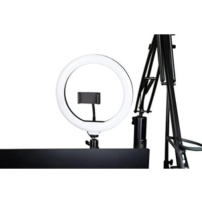10” LED Ring Light: Designed for podcasts, streaming, content creation, photography, and videography Customizable Lighting: Three color modes (cool, neutral, warm white) with 10 brightness levels (3200K, 4500K, 5500K) Adjustable Phone Mount: 360° rotating phone clamp with a 7” (178mm) gooseneck for portrait or landscape positioning Flexible Light Positioning: 180° ball-and-socket head adjustment with 1/4”-20 camera threads for secure mounting Convenient USB Power: 6’ (1.8m) USB-A cable with in-line remote for brightness and color control