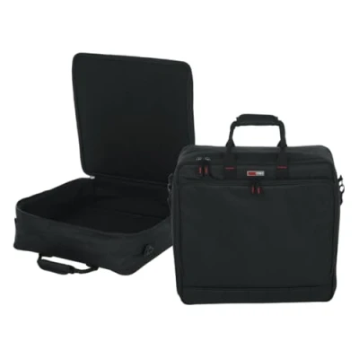 Padded Mixer or Equipment Bag with Rugged Nylon Exterior 10mm Dual Layer Padded Protection and Protective Tricot lined interior prevents scratches External storage pockets, with cord management, for cables, small accessories and power supplies Removable shoulder strap & comfortable webbed handles for easy transport Interior Dims: 18" x 18" x 5.5"