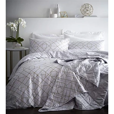 Contemporary dark gold geometric pattern over an off white background. Fully reversible, with a unique design on the other side 100% 200 thread count cotton percale Super King duvet cover (220 x 260cm) and 2 pillowcases (50 x 75cm) Machine washable Matching throw over available separately.