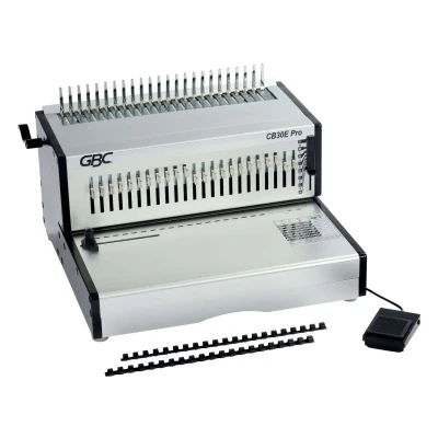 The CombBind® CB30E Pro is a robust and durable electric comb binder designed to handle tasks in office, home, and school environments with medium to high volume usage demands.Its adjustable selector pins effortlessly adapt to paper sizes up to A4, offering customizable margin depths to suit your needs.Engineered for simplicity, it features a convenient clippings tray for easy disposal. With the capability to punch through up to 30 x 70gsm A4 sheets, this reliable binder can efficiently bind up to 500 sheets at a time using 51mm spines.Compatible with comb sizes 6mm to 51mm