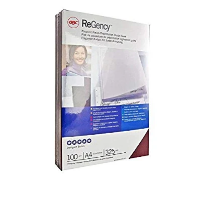 Premium finish: ReGency Covers add the finest of 'leather-look' finishes to any document. Strong: made from 325gsm heavyweight card, ReGency Covers give documents a professional feel whilst protecting them from damage. Available in a choice of 4 formal business colours: white, black, blue and burgundy. Available in A4 format only. ReGency Covers are available in packs of 100.