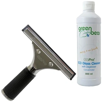 GBPro SET SAVERS: - Save with our combi set on our 15cm/6" window squeegee coupled with our CONCENTRATED Eco Friendly Glass Cleaner with DEGREASER to remove traffic, everyday film on the windows. Can also be used internally and on any smooth surfaces, mirrors, chrome, etc., for a smear free sparkly clean finish – “A Little Goes A Long Way” – Professional cleaners little secret. AVAILABLE IN 15CM, 25CM, 35CM, 45CM SIZES - Ideal squeegee for windows, Wet rooms, Bathroom tiles, shower glass screens, conservatories, etc. The 15cm (6") is ideal for Georgian window panes and small awkward areas - Made in the EU PROFESSIONAL GBPro HIGH GRADE ‘DOUBLE SIDED’ PLIABLE RUBBER BLADE - for ease and professional smear free finish, developed for all temperatures. Machine cut so as to eliminate smears – Double the life with two edges, just slide out and reverse and continue smear free PROFESSIONAL NON-SLIP RUBBER GRIP HANDLE – well balanced with chamfered hole decreasing from 2.6cm down to approx. 2cm (internally) which allows a simple pressure fit for attaching to our GBPro Extending Telescopic Pole (sold separately) enabling quick release. S-spring underside for simple blade channel bar changing and releasing the double sided rubber strip CRYSTAL-CLEAR, STREAK-FREE AND WITHOUT ANY SMEARS - Robust and Durable because of our Unique Grade Stainless steel – Teams up with our GBPro Micro-tiger, applicator, Eco Friendly Glass (+ degreaser) cleaner, Hip Bucket-on-a-Belt Holster and other accessories from the range. Developed by the Trade for the Trade