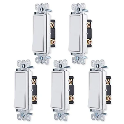 ************************************************************* or ************************************************************* – fix old or broken rocker switches in your bedroom, kitchen or work space with this GE Grounding paddle rocker switch 5 pack Single pole – for use with permanently installed Lighting Fixtures controlled by only one switch Colors – available in White and light almond to best complement your existing wall plate Do it yourself – complete instructions included in packaging for quick and easy, step-by-step installation Terminal screws accept up to no. 12 AWG Copper wire and pressure lock push-in terminals accept no. 14 AWG solid Copper wire only