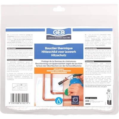 Heat shield semi-rigid, fireproof with flame burner Dimensions: 20 x 27 cm GEB is the benchmark for water resistance in the world of plumbing, sanitary, heating and swimming pool. French manufacturer, known for the reliability of its solutions since 1860. ISO 9001 certified Consists of high temperature glass fibres Protection of coatings (paints, wallpaper, fabrics, cladding, plaster) from the heat generated during soldering Reusable multiple times Bends and folds arbitrarily for angle welding: adapts to any shape Retains its shape throughout the time of soldering No unpleasant fumes Will not tear or peel off