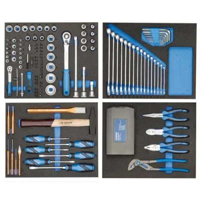 147-piece GEDORE tool set: high-quality wrenches, pliers, screwdrivers and more in one convenient foam modules for professionals and DIY enthusiasts DURABLE QUALITY: Made from premium steel, these tools meet the highest demands on durability and reliability Efficient organisation: the foam check tool module system ensures clear storage and quick access to all tools; Due to the different colour of the insert, any missing tool is immediately detected MULTIPURPOSE Whether it's repair, assembly or maintenance, this kit covers a wide range of requirements GEDORE Warranty: trust in the proven GEDORE quality guarantee for unmatched performance and longevity Box contents: 1x GEDORE tool assortment including 147 tools with 4 foam inserts in the dimensions 390 x 316.5 x 35 mm and a total weight of 11.98 kg, Manufacturer: GEDORE Werkzeugfabrik GmbH & Co. KG