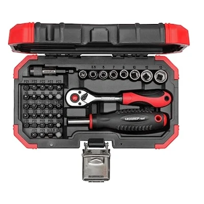 Bit screwdriver with strong magnet for easy and quick replacement of bits and ergonomic handle, reversible ratchet with 2K handle and 5° rear swivel angle and switch lever for comfortable change of direction Bit adapter allows alternative drive of the bits with the reversible ratchet, quick change adapter allows quick bit changes Socket spanner inserts with non-slip longitudinal knurling Storage in robust BMC 1 x Gedore bit set, 1/4 inch, 40 pieces, weight: 800 g, item number: R33003040, Weight: 1.763698096 pounds, Manufacturer: GEDORE