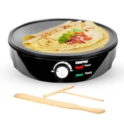 JoybuyThe Geepas 1000W Pancake&Crepe Maker features a large, non-stick hot plate with raised edges and adjustable temperature control for perfect crepes, pancakes, omelettes, tortillas, and more. It includes a wooden spreader and spatula for easy use, and is easy to clean with a 2-year warranty.