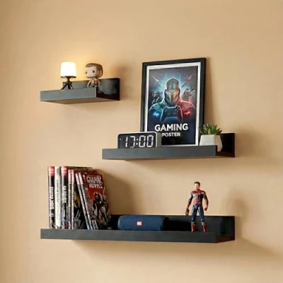 VERSATILE 3-PIECE SET: Create dynamic wall displays with this set of 3 shelves in different sizes. The varied lengths provide endless arrangement options. These black floating shelves for wall are perfect for any space. MODERN SEAMLESS INSTALLATION: Achieve a clean, floating look instantly. This set of three wall mounted shelves includes all hardware and instructions for quick setup. The seamless design makes these floating black shelves look built-in. CREATE STYLISTIC WALL ART: Use the three different sizes to curate unique displays of art and décor. These picture shelf ledge designs are a great addition to any floating wall shelves for living room collection for books, perfumes, or collectibles. COMPLETE STORAGE FOR ANY SPACE: Ideal for utilising wall space. Organize books and décor in the living room. Store cosmetics in the bathroom and personal items in the bedroom. SPECIFICATIONS: Package Dimensions: Height: 46 cm, Width: 12 cm, Depth: 5.5 cm / Package Weight: 830 g / Material: Plastic / Color: Black / Fixtures and Fittings Included / Large Shelf Dimensions: Width: 10 cm, Depth: 5 cm, Height: 45 cm, Medium Shelf Dimensions: Width: 10 cm, Depth: 5 cm, Height: 30 cm, Small Shelf Dimensions: Width: 10 cm, Depth: 5 cm, Height: 15 cm / Weight : 830 g