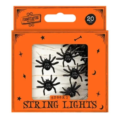Choose from spider, bat or pumpkin designs and add atmospheric glow to parties and displays with these battery-powered Halloween string lights. The fine wire makes them easy to wrap around props, frames and shelves for instant spooky ambience.. Assorted designs: Spiders, Bats or Pumpkins. Battery powered (requires 2 × AA, not included) for flexible placement. Approx. 2m total cable length; first light ~28cm from battery box. Fine connecting wire wraps easily around objects, frames and wreaths. Ideal for mantels, shelves, door frames, table centres and party backdrops (indoor use recommended)