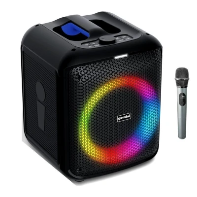 Currys- The Gemini Boombox's 100 W output gives you big, clear sound, whether it's a beach party or a cozy indoor vibe - Double the sound by pairing two boomboxes with true wireless stereo- You get about 10 hours of battery, and when it runs low, just charge it with the USB- With the karaoke mic, you can dive straight into a singalong- Create a party vibe with colourful LED lights- Grab calls handsfree thanks to the built-in microphone