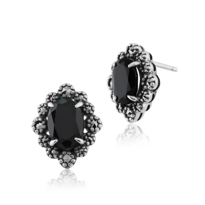 Gemondo 925 Sterling Silver 2.00ct Black Spinel & 0.24ct Marcasite Art Deco Stud Earrings